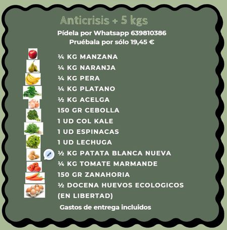 Cesta Anticrisis + 5 kgs de Frutas, Verduras y huevos ecológicos. Producto SIN COSTE DE ENTREGA